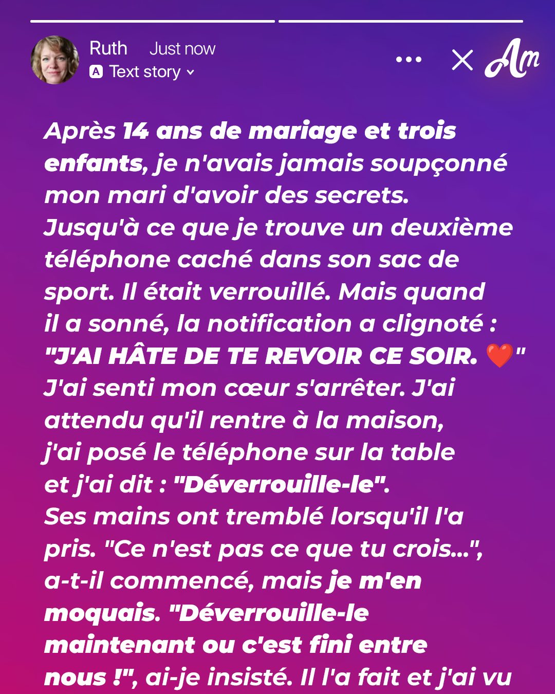 Ce n’était pas le téléphone habituel de Chad. Celui que j’avais tenu une centaine de fois, lisant des textes à voix haute pendant qu’il conduisait. Celui dont je connaissais le code d’accès. Celui sur lequel nos enfants avaient joué en attendant chez le médecin.