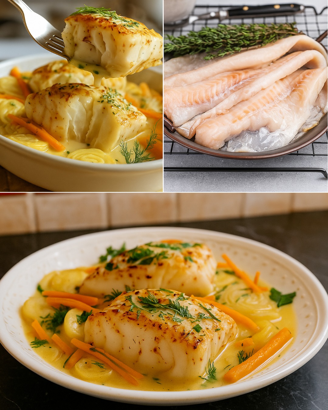 Les filets de cabillaud au four avec sauce crémeuse, pommes de terre et carottes sont une recette simple, équilibrée et raffinée. Le cabillaud fondant s’associe à la douceur des légumes et à une sauce légère et parfumée, pour un repas complet et réconfortant. Parfait pour un déjeuner en famille ou un dîner sain et savoureux.