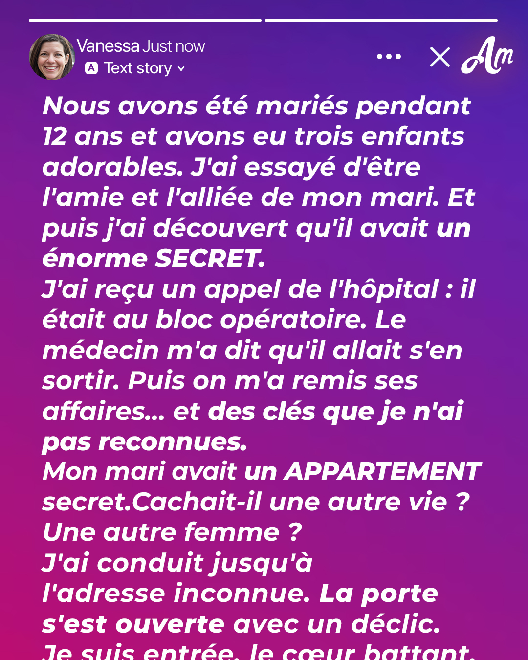 Quand mon mari a été hospitalisé, je me suis précipitée à ses côtés, mais rien ne pouvait me préparer à ce que j’allais découvrir. Parmi ses affaires, il y avait un trousseau de clés que je n’ai pas reconnu. Il s’agissait d’un appartement que je n’avais jamais vu. Cachait-il une autre femme ? Une autre vie ? Je devais connaître la vérité. Alors, j’ai déverrouillé la porte.
