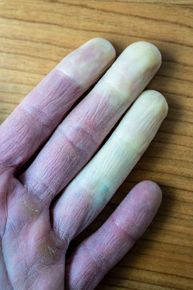 Résultat : une production soudaine et impressionnante. Les extrémités deviennent blanches, voire bleues, avant de reprendre leur teinte normale une fois réchauffées. Cela peut durer quelques minutes, parfois jusqu'à quinze minutes.
