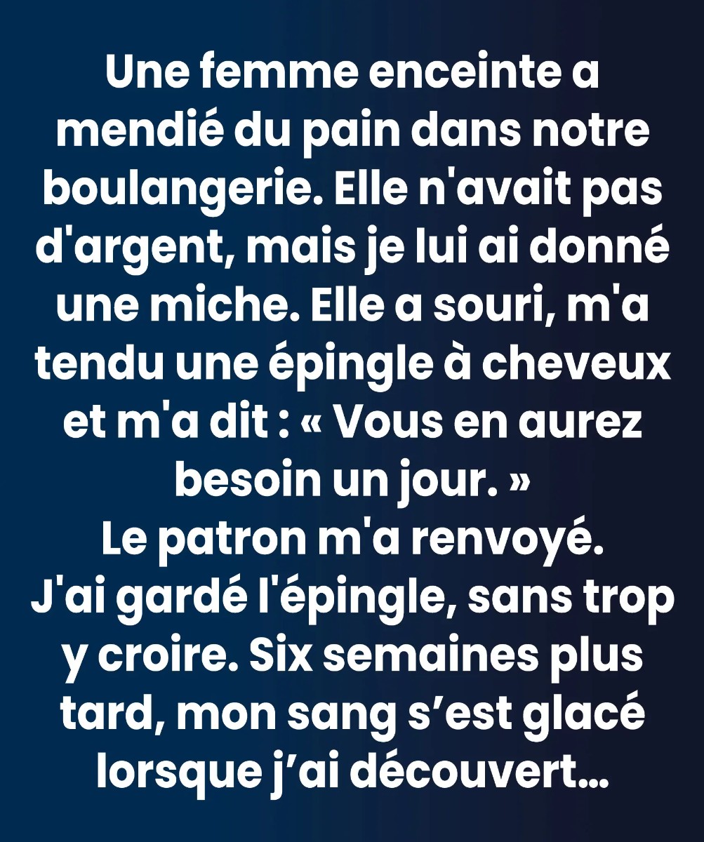 Ce jour-là, la boulangerie était calme, presque trop. Une femme enceinte pousse la porte, l’air hésitant. Elle demande un pain, humblement, mais avoue ne pas pouvoir le payer. Devant elle, la jeune vendeuse, Camille, ressent un élan instinctif : elle lui tend un pain encore chaud, simplement par humanité. En retour, la cliente, Élise, lui offre une petite épingle à cheveux, un objet modeste mais donné avec un sourire reconnaissant : « Tu en auras besoin un jour. »